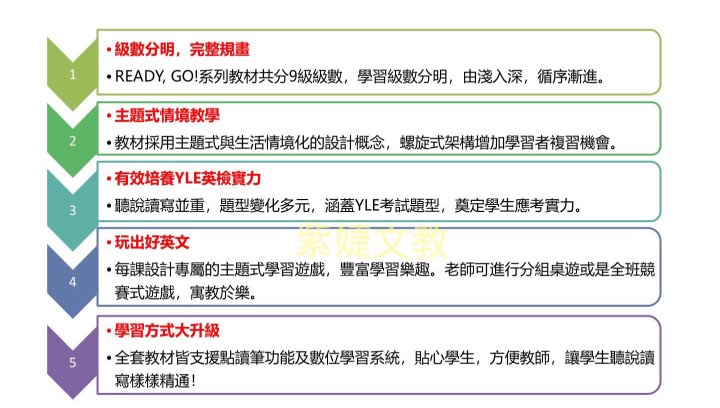 Ready, Go!系列教材共分9級級數,學習級數分明,由淺入深,循序漸進。