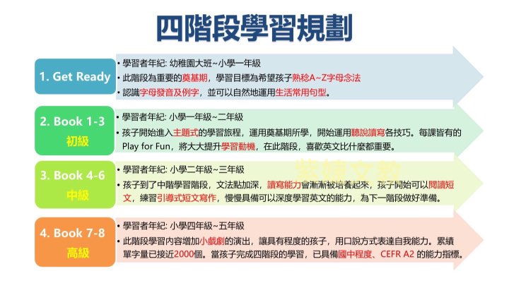●此階段學習內容接近國三該習得的知識,已學過的單字量已接近2000個。 ●當孩子完成四階段的學習,已具備國中程度,CEFR A2 的能力指標。 |
