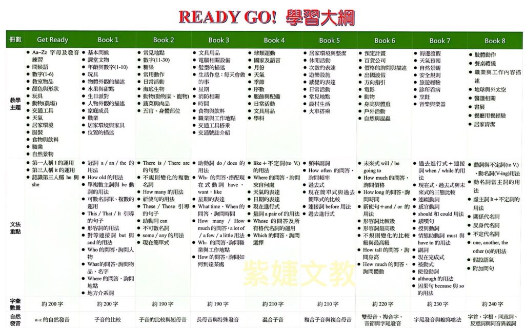 ●教材架構:Get Ready、Book1~Book8,共九冊。符合歐盟CEFR A1~A2指標,涵蓋國一~國三重點文法。