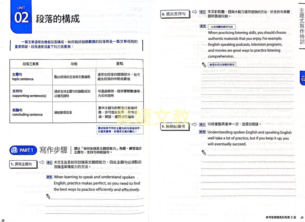 n 透過單元主題引導式練習,逐步強化寫作實力。