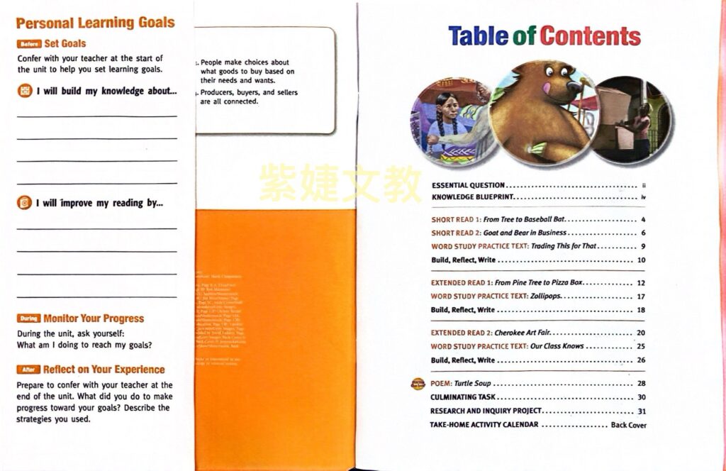 版面:精美大圖呈現閱讀篇章,激發學生的主題背景知識(background knowledge),同時亦降低學習焦慮感。練習題頁面則以簡潔的編排方式,讓教師及學生易於瞭解教學/學習重點。